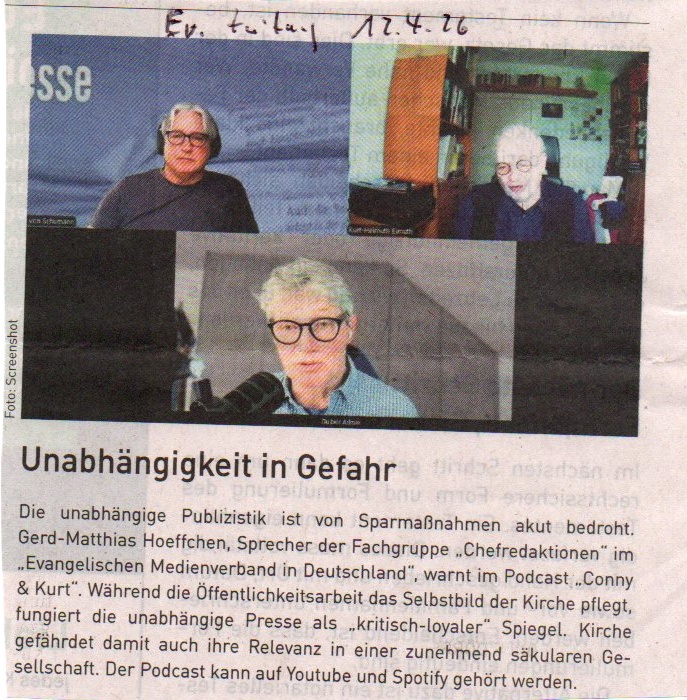 Gerd-Matthias Hoeffchen, Sprecher der Fachgruppe „Chefredaktionen“ im „Evangelischen Medienverband in Deutschland“, warnt im Podcast Conny&Kurt vor einer fatalen Verwechslung: Publizistik ist keine PR. Während die Öffentlichkeitsarbeit das Selbstbild der Kirche pflegt, fungiert die unabhängige Presse als „kritisch-loyaler“ Spiegel. Dieser Blick von außen, der die Perspektive der Kirchenmitglieder und Leser einnimmt, ist eine Lehre aus den Erfahrungen des Dritten Reiches. Man wollte nach dem Krieg eine Instanz schaffen, die eben nicht in die hierarchische Weisungskette eingegliedert ist, um eine erneute Gleichschaltung zu verhindern.